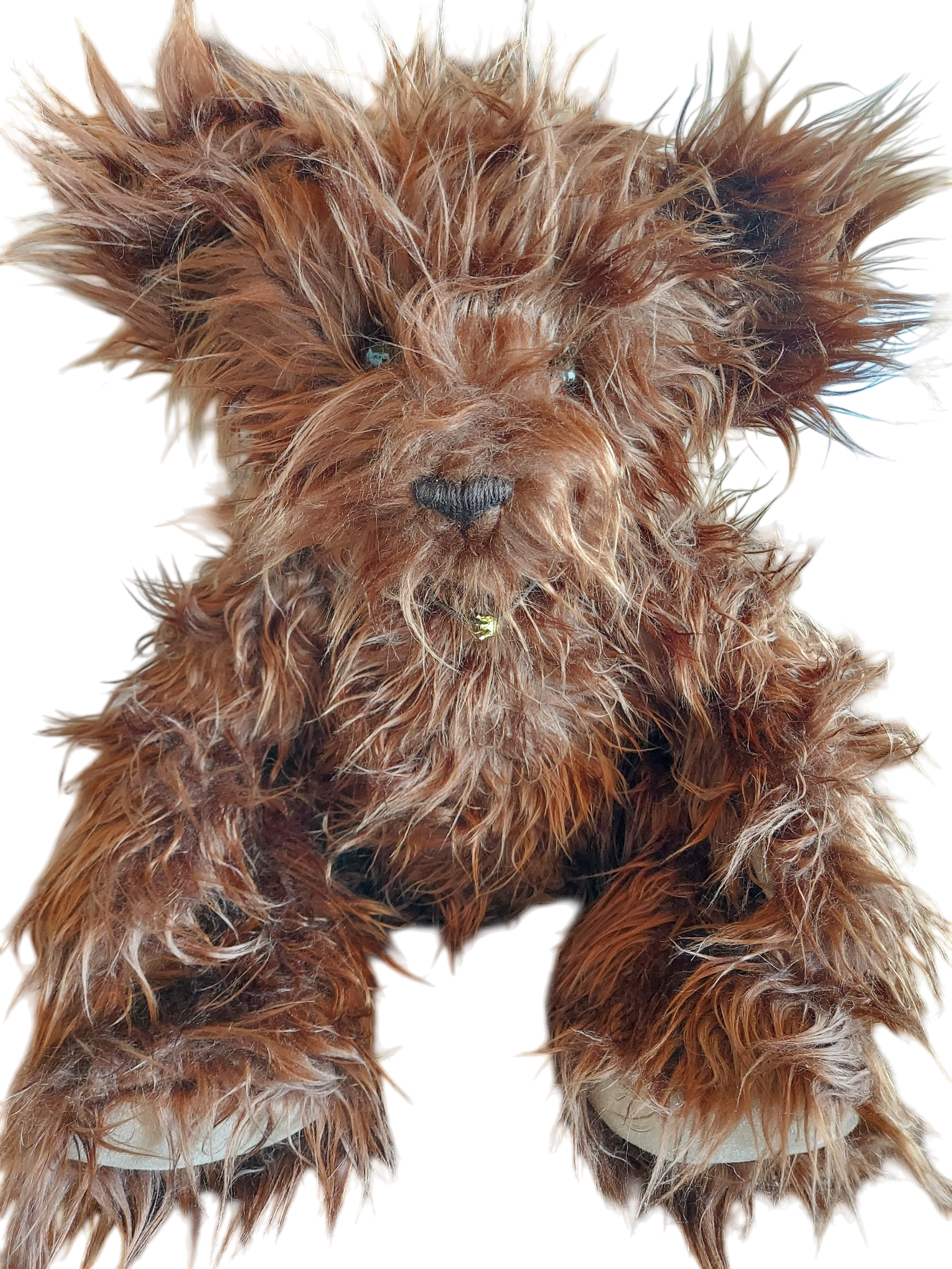 kuschelweiches Langhaarplüsch in dunkelbraun, braune Glasaugen, Nasengarn schokobraun, veg. Pfotenleder in graubeige, Baumwollfüllung und Glasgranulat, 5 Vintage-Gelenke
